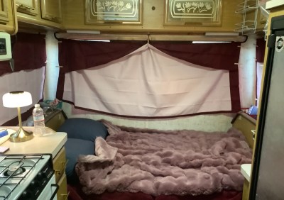 The coach was skin and bones when we got to Washington. So we went to Walmart, and bought some of the supplies we needed. This is a makeshift adaptation of what it will be. Love those blankets. The curtains will eventually fit. I love that little battery operated light to play dominos by.Look at my horrible draw😳