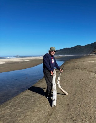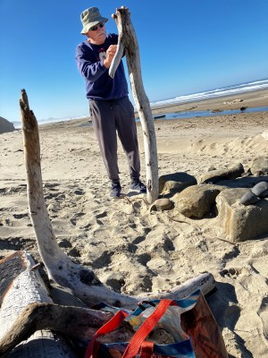 I wrapped our driftwood up tight in some wide Christmas Saran wrap that I had put in the coach a long time ago. It was still there and came in handy that day, I wanted to keep sand and any bugs it had trapped. We haven’t put them in the yard yet, we’re still deciding where they should go.
