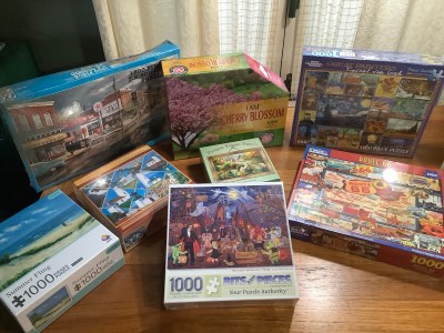 I have a harder time finding unopened puzzles from thrift stores now, but this trip I found 8 all together, 4 at the Ventura store. Plus we found a lot of other good stuff, useful stuff for the coach. Most thrift stores have a lot of new merchandise now at lower prices. We got some great new socks.