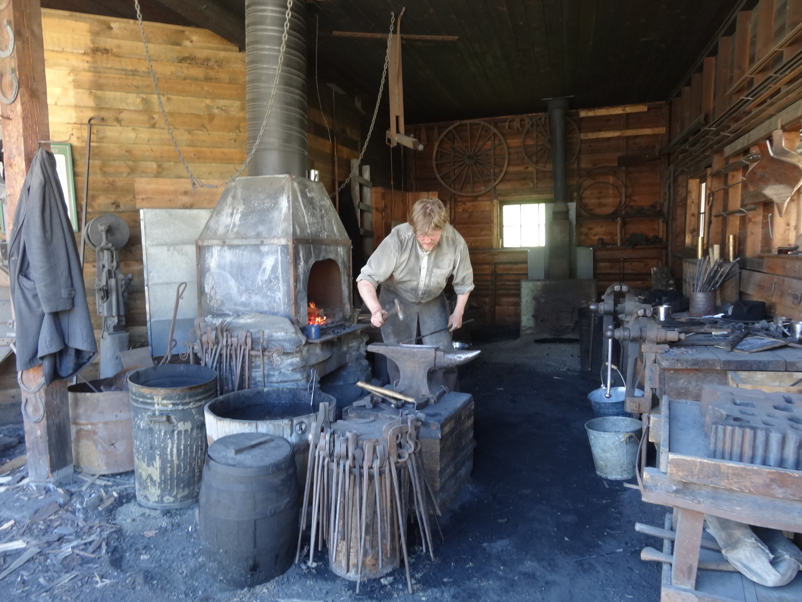 he has been at barkerville 10 years. you could tell he knew what he was doing. he would put the metal in, keep checking the color, put it back in, bring it out, pound on it, put it back in. then he took it over to the vice and twisted it. he put it back in, took it out, put water on it, twisted it, put it back in, pounded on it some more. so on and so on.