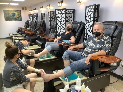 tracy wanted to get a pedicure for her birthday so we did that. jerry got one too. i got a manicure.