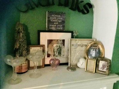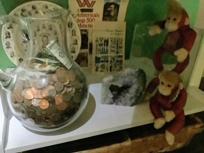 also two new national parks, two new national monuments, and drove through two new national forests. we didn’t have to do dishes, or laundry. not even once for a whole month. and we probably only got a half dozen phone calls. and we found $12.36 to add to our found money jar. i started putting found money in here years ago. my mother got this princess house picture for us, i think back in our sangria drinking days. it sits on this shelf in the dining room now. it is very heavy.