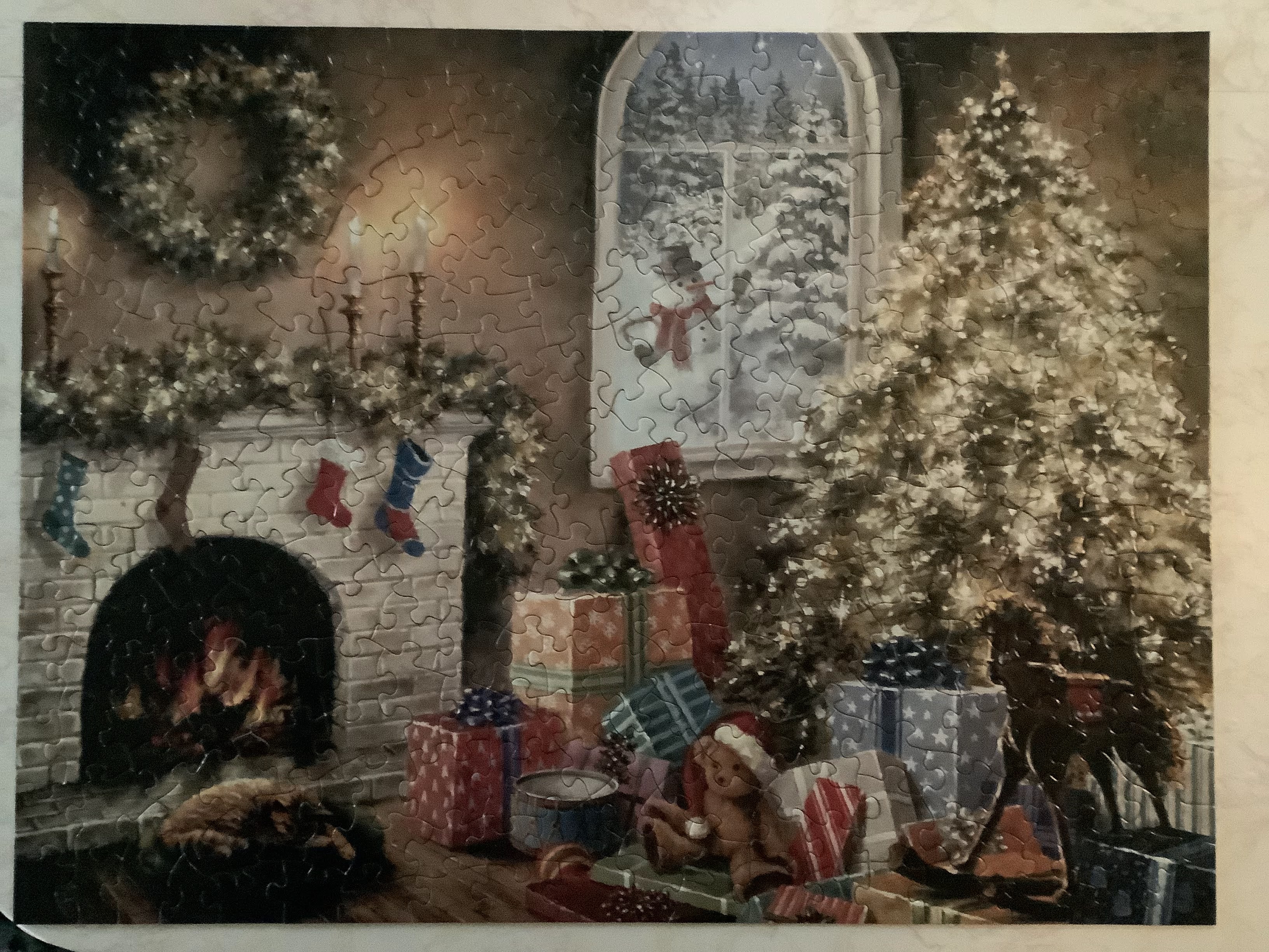 this recent puzzle depicts what i wanted as a child. or what i thought Christmas should look like. it looks so cozy and warm with stockings hung by the fire, lots of presents under the tree. even a cat warming itself by the fire. and a snowman outside in that white Christmas scene, which i could have built. maybe.