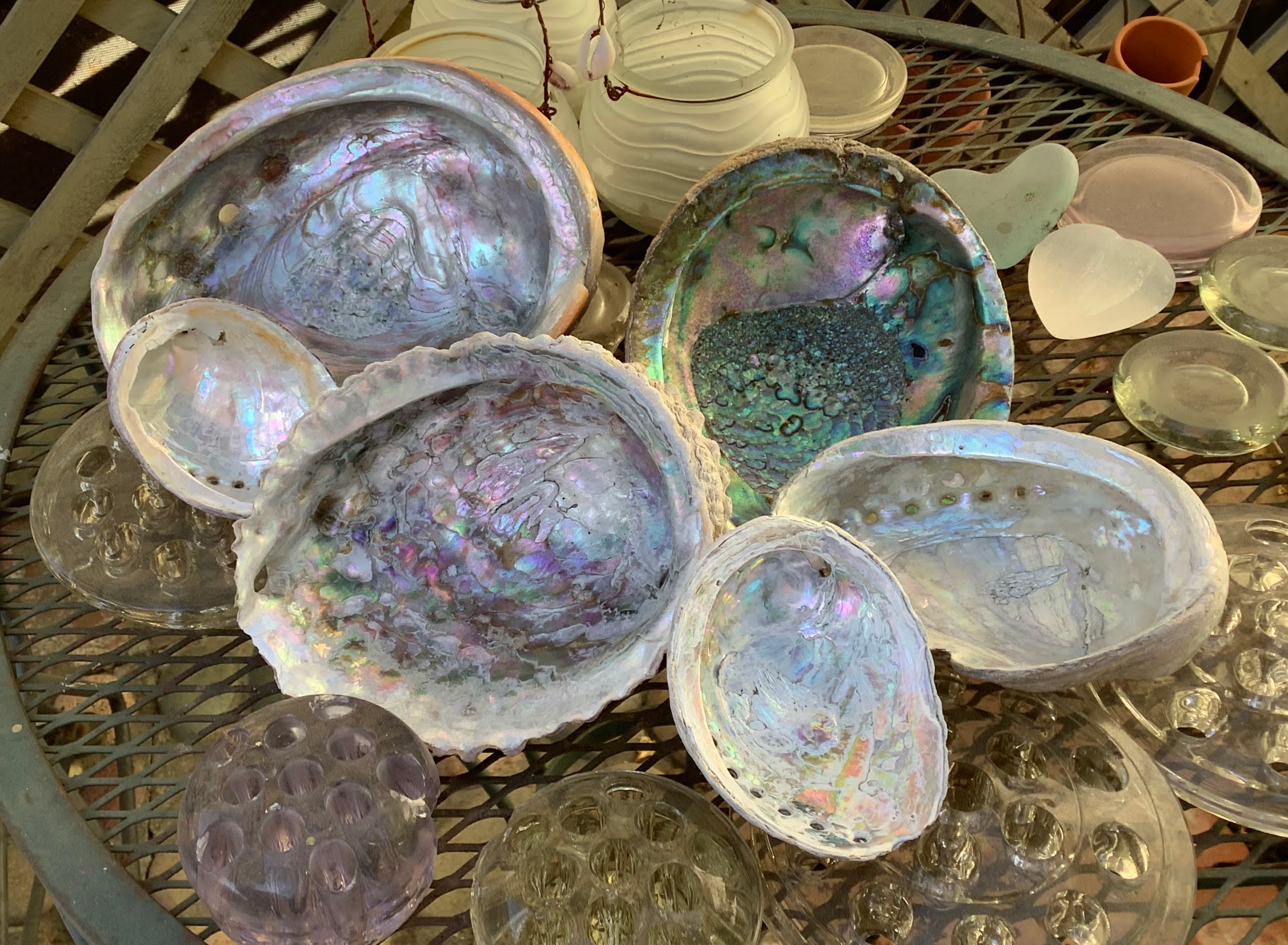 I removed the abalone shells from my ‘stuff shelves’ to find another place to put them. I’d like to have them outside, but afraid they might disappear out front on our beach, like they do on the real beach’s. they are all so similar – yet so different.