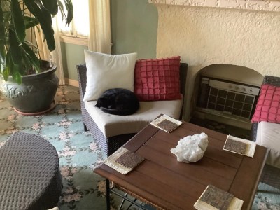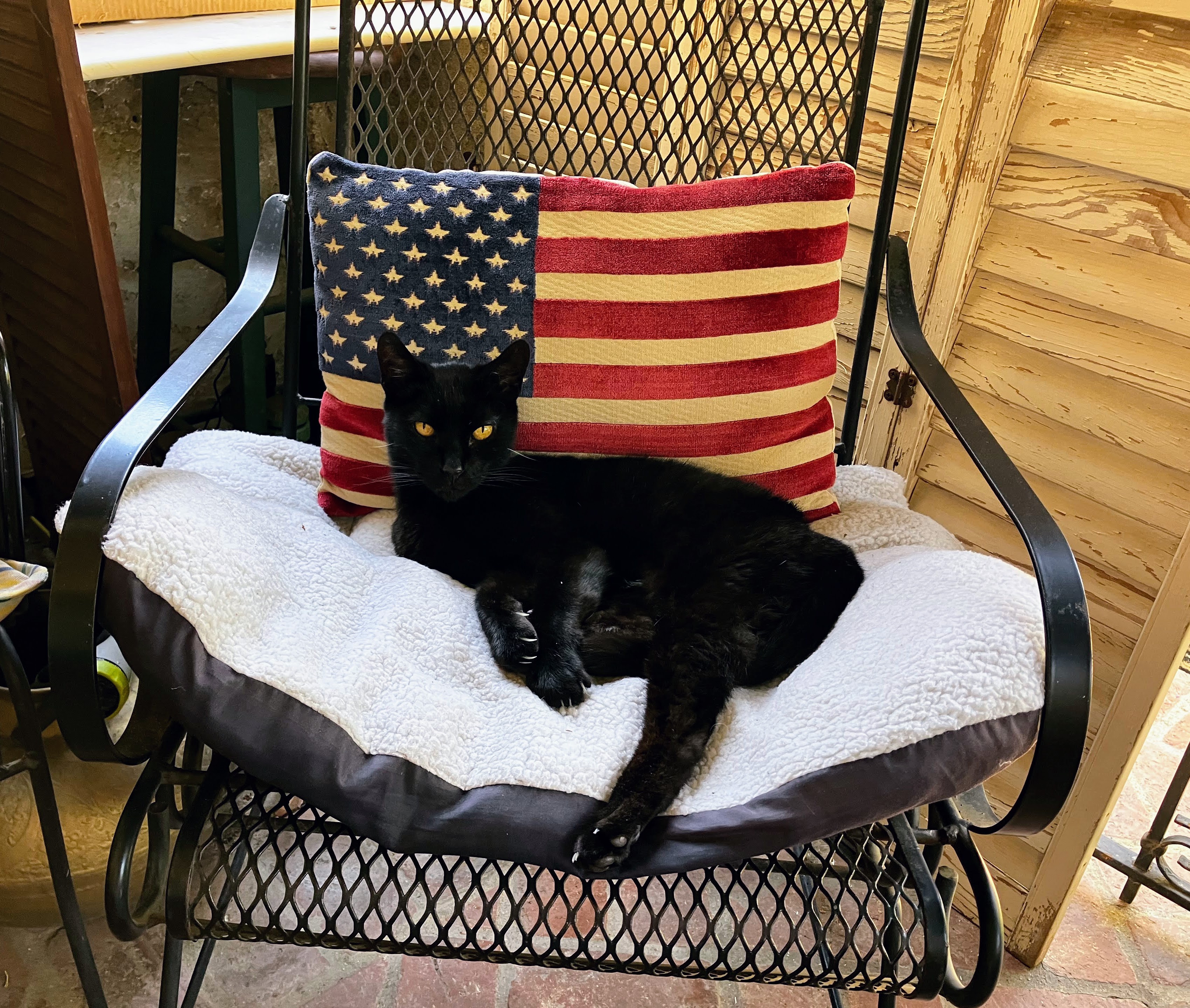 I know how much all of you love your pets and how much pleasure and joy they bring you, just like our Midas. We were thrilled when after 14 years of never wanting to be an inside cat, he decided to run in out of the rain and now it’s the heat. He still wants to go outside to roam his territory, roll in the sand, chomp on the catnip, and hunt for lizards. He will let us know with that unmistakable caterwaul when he wants back in. In the beginning he was following me around like a new puppy, constantly wanting to sit in my lap for attention and wasn’t happy until I sat down. But then he discovered our bed after starting to sleep with us. Now he hangs out there during the day a lot.
