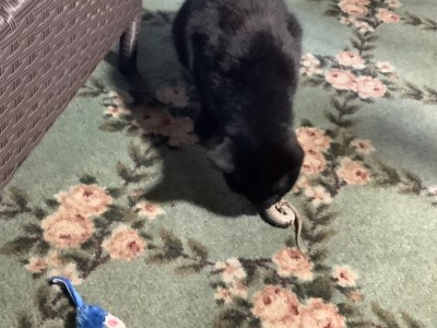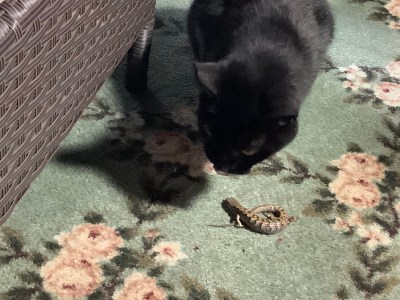 This is not pretty but this is what outside cats do-they hunt. And they sometimes eat what they catch. Midas has always brought us mouse and lizard parts to the front porch. We’ve seen him catch them a lot. This day he ran in the house before we saw what he had in his mouth. He dropped it and killed it very quickly.