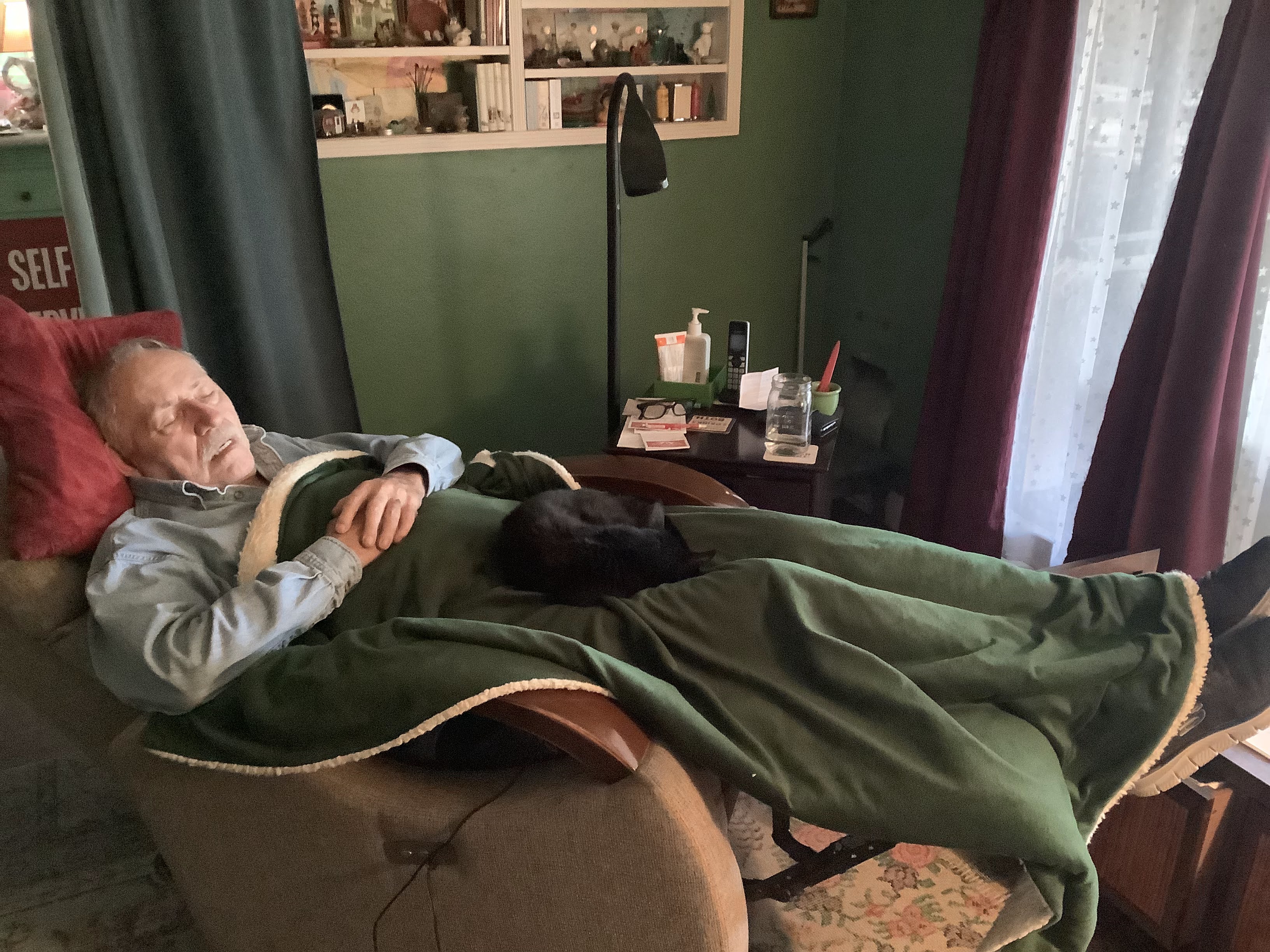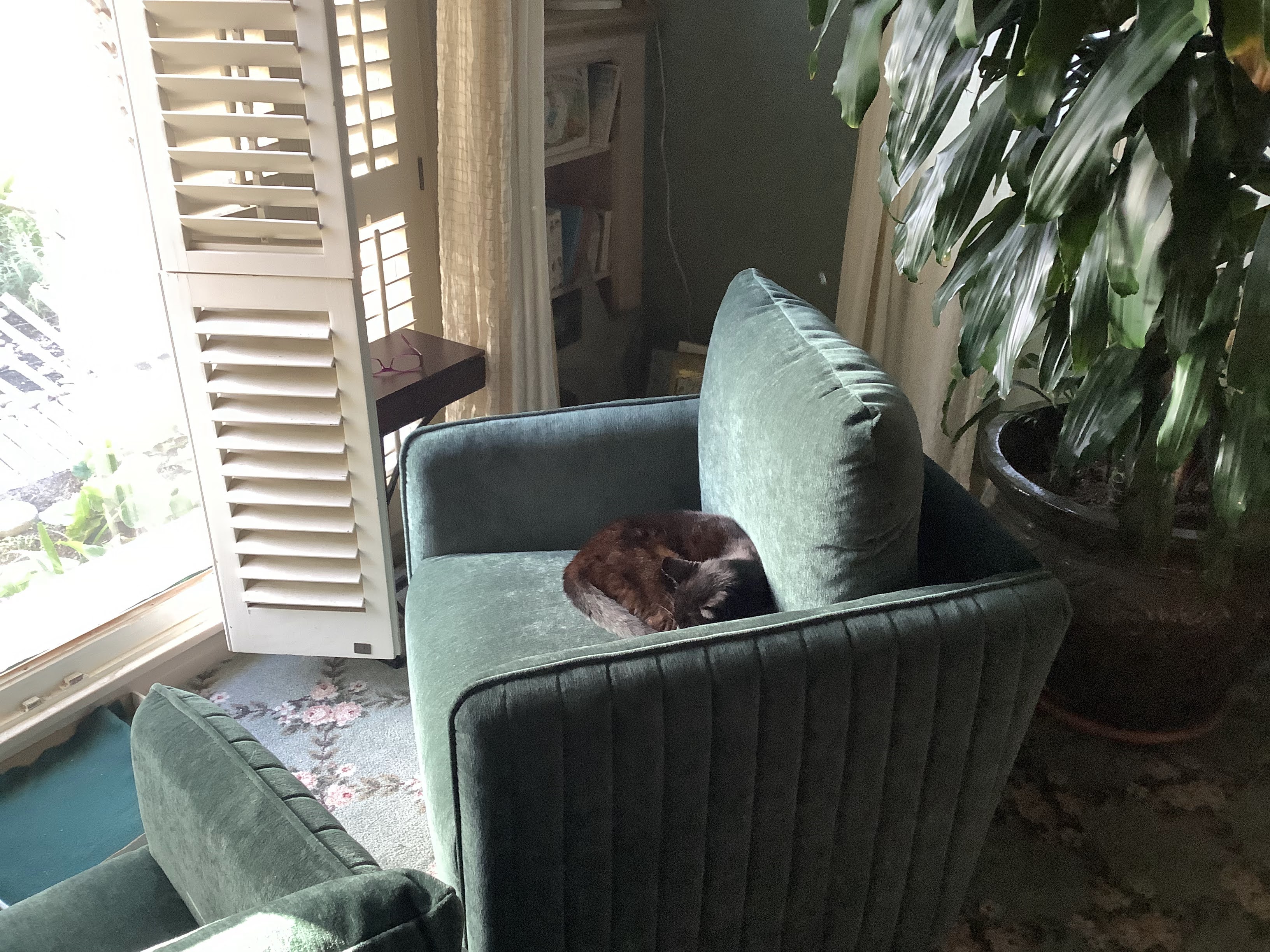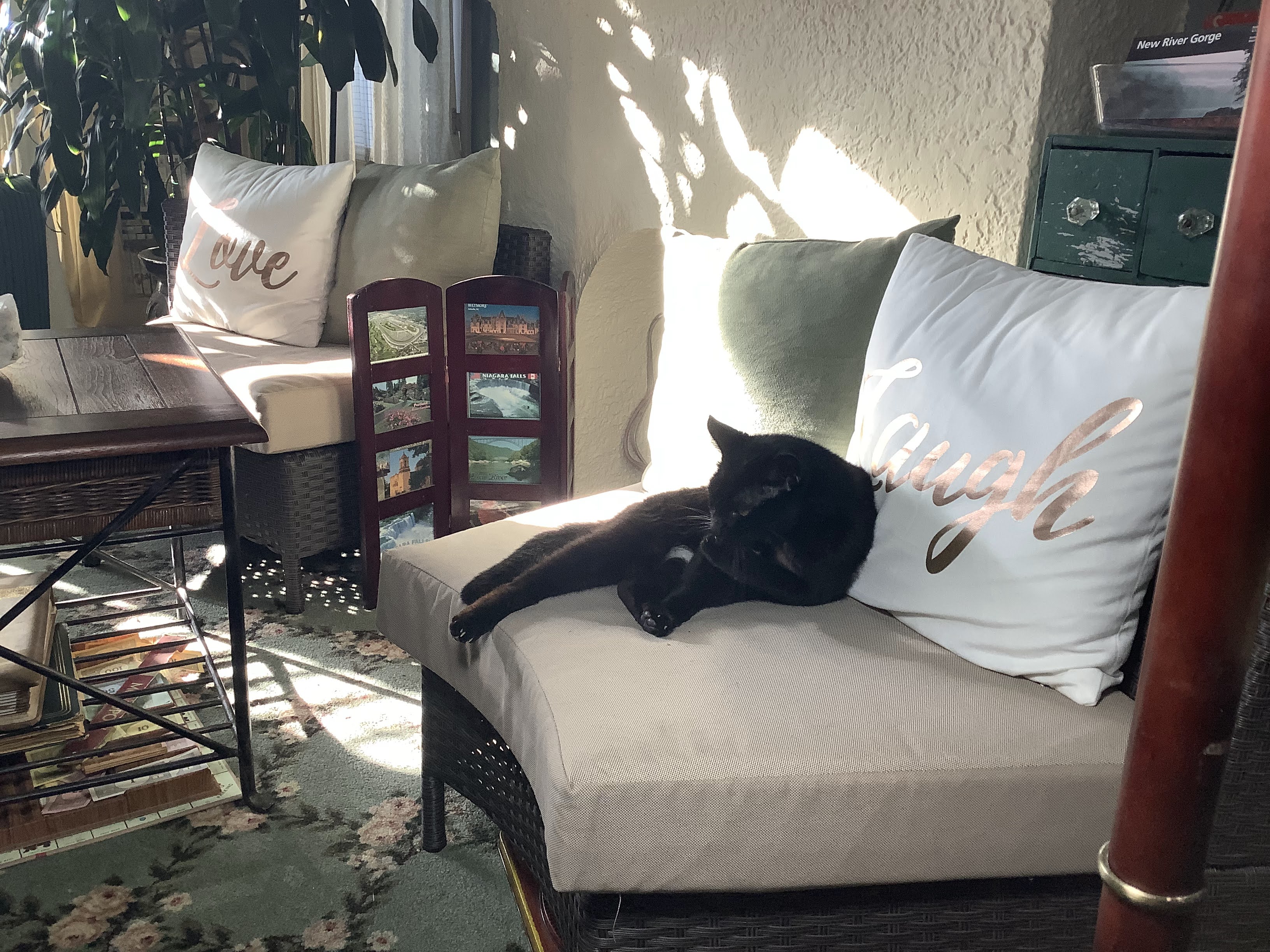 he gets the sun here in our new chairs during the cold days,