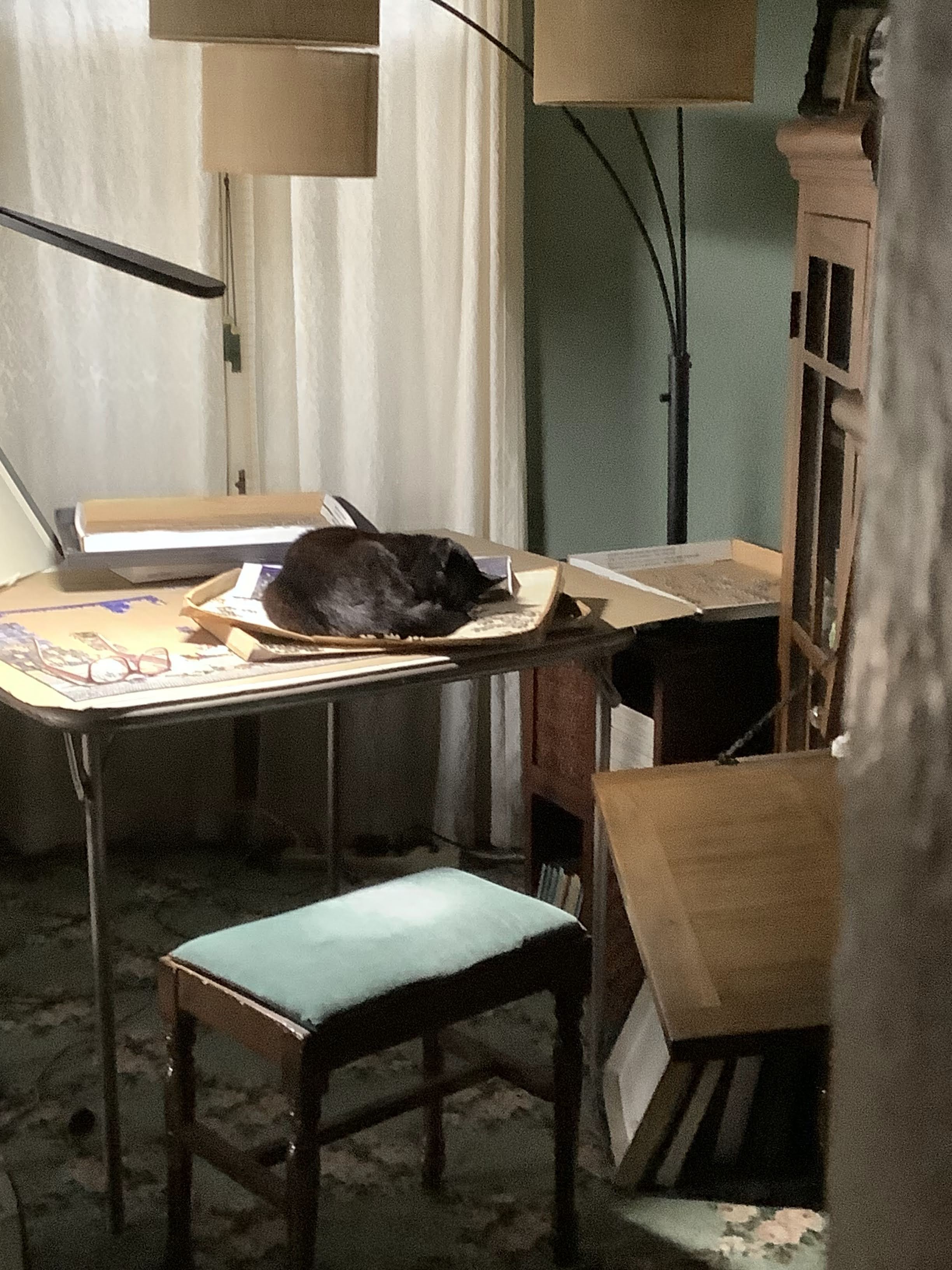 Midas really wants to lay on my puzzle table a lot more now. Maybe the lamp keeps him warm? Of course that can spell disaster to a puzzle in progress. Especially if I have them sorted to my liking. I catch him up there pretty often. He looks a little devilish in that light doesn’t he?