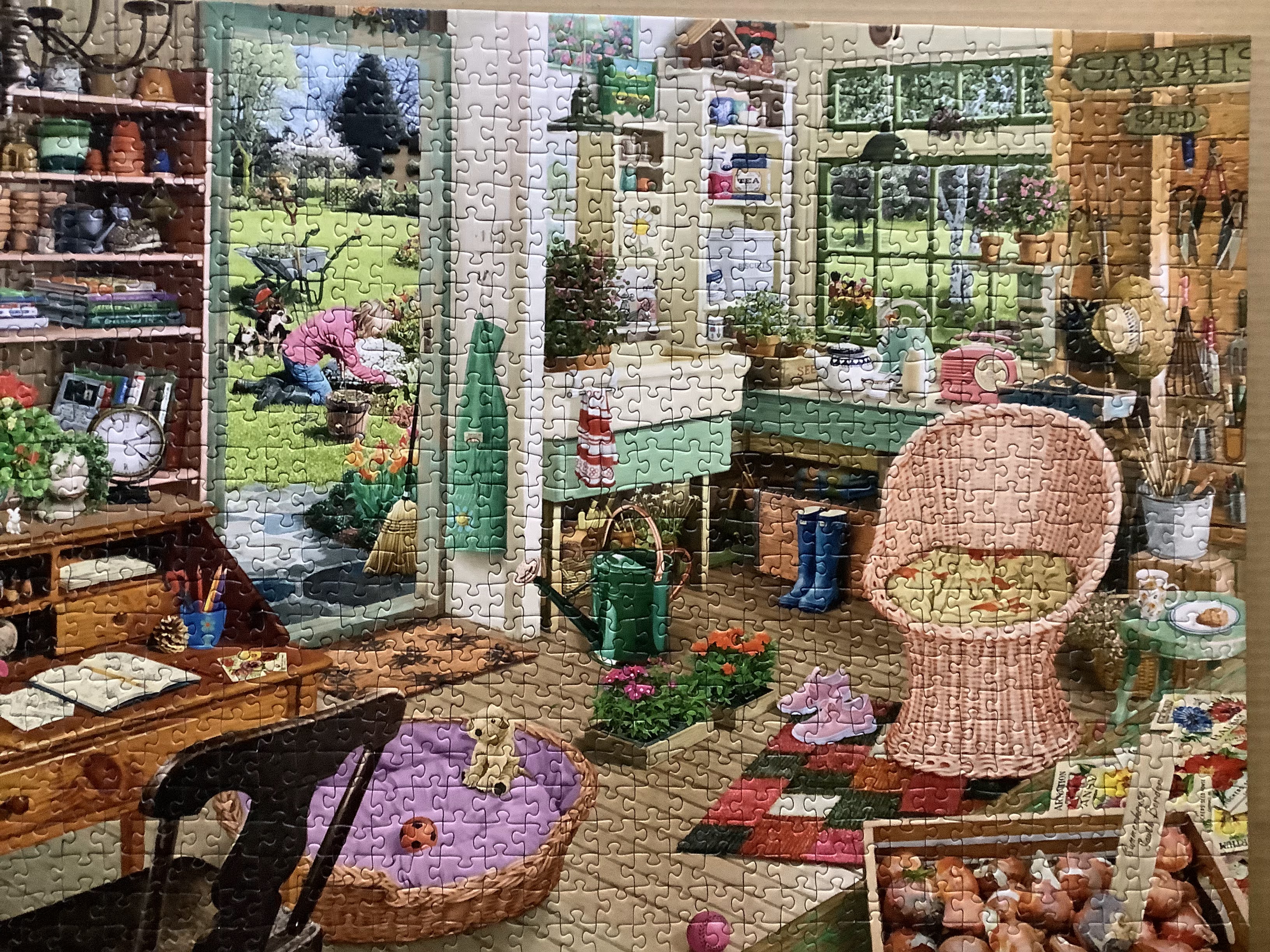 I will probably always put pictures of my puzzles in too. I spend so many joyful hours on piecing them together, forgetting all my troubles in the process. I finished the one from sharon, all the time dreaming of that pink wicker chair; and of course the shed too💗